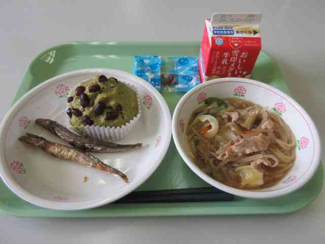 今日の献立は、サンマーメン、ししゃものからあげ、抹茶蒸しパン、アーモンド、牛乳です。 豚肉とキャベツは神奈川県内産です。 茶摘みの歌にある八十八夜はお茶の新芽が育つ茶摘みの季節で、今年は5月1日でした。お茶の渋みのもと、カテキンにはいろいろな働きがあって、緑茶をよく飲むと元気に生きできるといわれています。今日は緑茶を粉にした抹茶と小豆の甘納豆、牛乳で抹茶蒸しパンを給食室で手作りしました。 牛乳は、体をつくるもとになる赤のなかまの食べ物です。【添付ファイル】