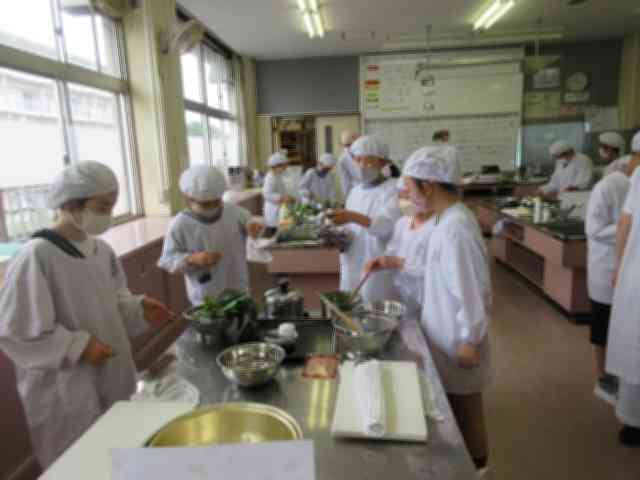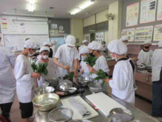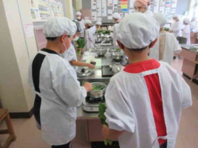5年生の調理実習の2回目は、 「青菜をゆでよう」でした。 お鍋にお湯を沸かし、 一人一人が自分の分の青菜をゆでました。 時間を計りながら慎重に実習をしていました。 学校で調理すると苦手なものでも食べられるのが不思議ですね。