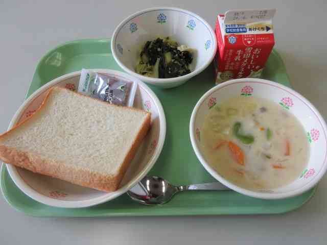 今日の献立は、食パン、そら豆のシチュー、キャベツとわかめのサラダ、いちごジャム、牛乳です。 そら豆は、空に向かってさやが伸びることからそら豆と呼ばれるようになったそうです。そら豆は、たんぱく質の他に鉄分やビタミン、亜鉛など成長期のみんなの体づくりにぴったりな栄養がたくさん入っています。今が旬のそら豆は、塩ゆでや炒め物にしてもおいしいのですが、今日はシチューにしました。 そら豆は、体の調子を整えるみどりのなかまの食べ物です。【添付ファイル】