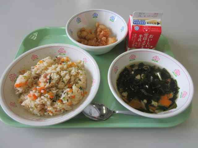 今日の献立は、にんじんチャーハン、大豆とホキの甘辛あえ、わかめスープ、牛乳です。 小松菜は、相模原市内産です。 にんじんは、給食ではほとんど毎日使われる野菜です。にんじんには、病気から体を守ってくれたり、目やのど、ひふを丈夫にしてくれたりする働きがあります。今日はたっぷりのにんじんをハムと玉ねぎ、小松菜、しょうがとごま油で炒めて、ご飯と合わせてにんじんチャーハンにしました。 にんじんは、体の調子を整えるみどりのなかまの食べ物です。【添付ファイル】