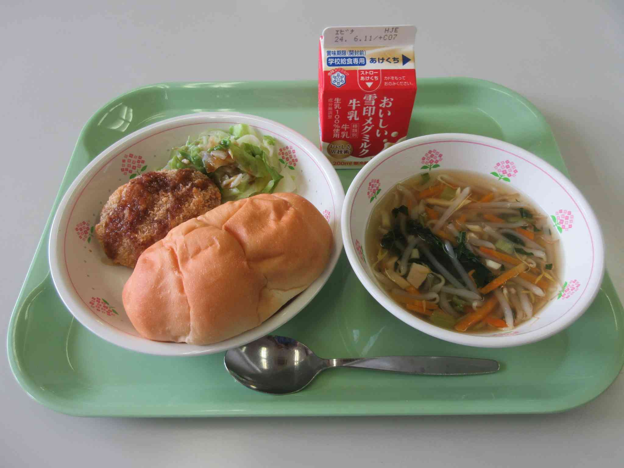 今日の献立は、ロールパン、白いんげん豆のコロッケ、ゆでキャベツ、五目スープ、牛乳です。 小松菜は相模原市内産です。 コロッケは給食室の手作りです。まず、豚ひき肉と細かく切った玉ねぎ、人参、パセリを炒めて、ポテトと白いんげん豆を合わせて、コロッケの中身を作ります。1つずつ形を整えて、小麦粉とパン粉で衣をつけて、油で揚げます。今日は920個のコロッケを調理員さんが作ってくれました。 パンは、熱や力のもとになるきいろのなかまの食べ物です。【添付ファイル】