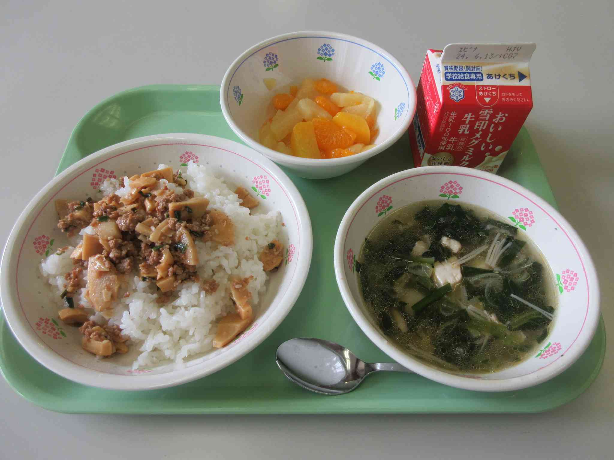 今日の献立は、たけのこと豚肉のオイスターソース丼、中華スープ、フルーツあえ、牛乳です。 小松菜は相模原市内産です。 オイスターソースは、中国の調味料の一つです。海でとれる貝のかきから作られます。オイスターソースは、おいしいうまみとコクが出るので、焼きそばなどの炒め物や煮物やスープ、チャーハンなどによく使われます。今日はたけのこと豚肉、万能ねぎなどを炒めて、オイスターソース、砂糖、しょうゆで味付けしました。 ごはんは、熱や力のもとになるきいろのなかまの食べ物です。【添付ファイル】