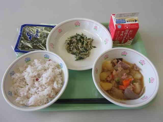 今日のこんだては、梅ちりごはん、肉じゃが、きゅうりのごまあえ、牛乳です。 じゃがいもは相模原市内産、豚肉ときゅうりは神奈川県内産です。 雨がたくさん降る時期を梅雨といいます。梅と雨で梅雨と読みます。梅雨の時期は梅の実が大きく実り、収穫される時期です。昨日6月10日は「入梅」といって暦の上では梅雨を迎えました。梅ちりごはんには、梅とちりめんじゃこが入っています。梅のすっぱい成分はクエン酸で、疲れた体を元気にする働きがあるといわれています。 梅は、体の調子を整えるみどりのなかまの食べ物です。【添付ファイル】