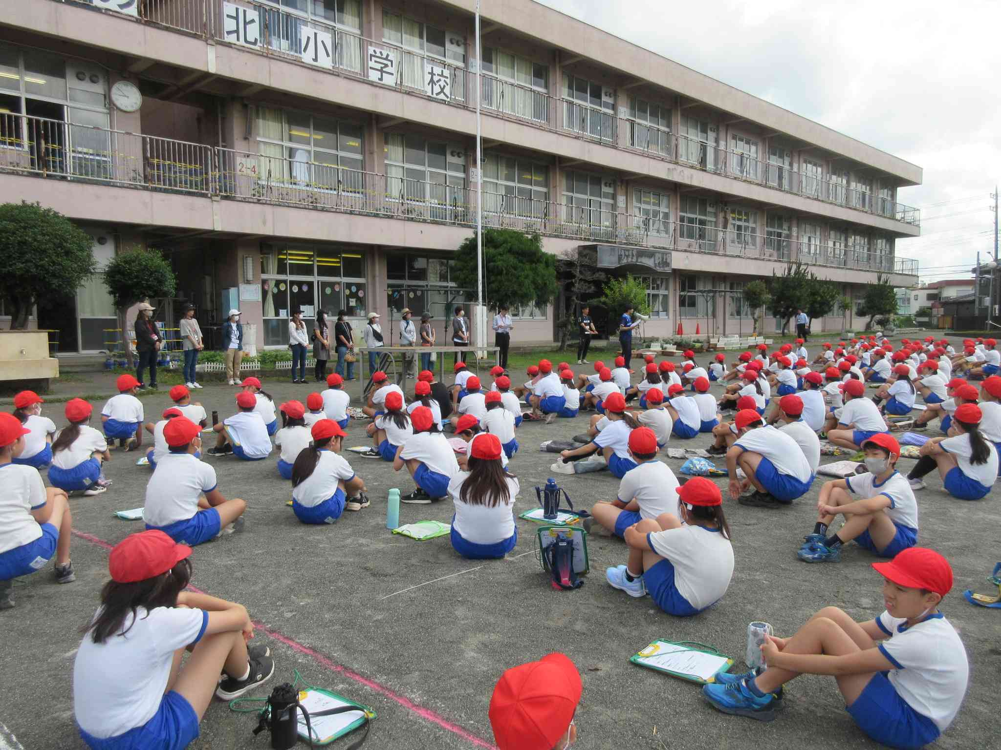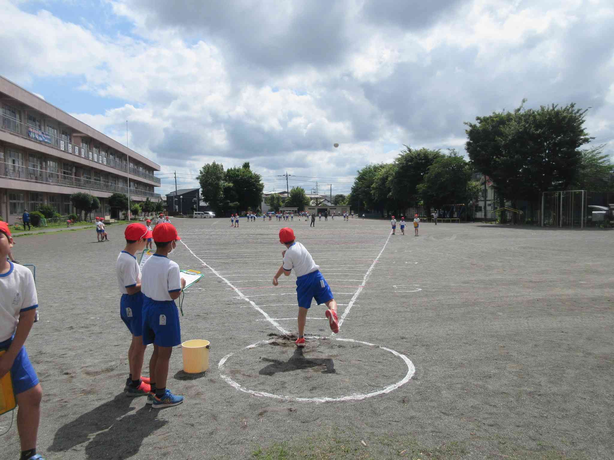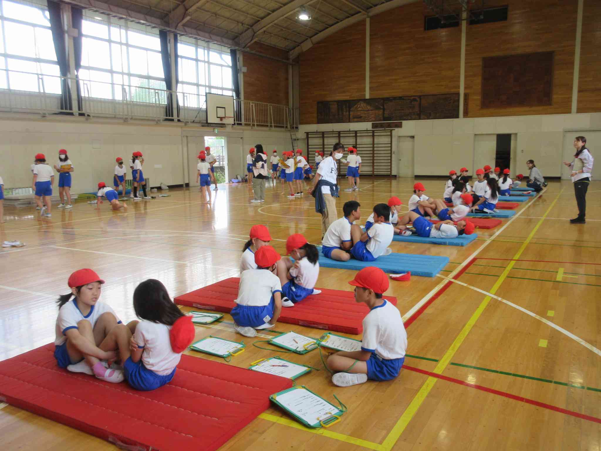 5年生が体力テストを行いました。 ソフトボール投げや反復横跳びなど、 普段はやらない動きはなかなか難しそうでした。 サポート隊の方々がお手伝いしてくださいました。