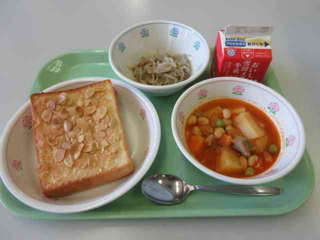 今日の献立は、アーモンドトースト、ポークビーンズ、もやしのソテー、牛乳です。 じゃがいもは相模原市内産です。 今月は食育月間です。給食を食べることを通して、今の自分の食生活や食べ方について考えてみましょう。「手洗いをしっかりする」「心を込めて食事のあいさつをする」「苦手はものも少しずつ食べてみる」「食事の準備、片付けをする」などできることをチャレンジしてみましょう。 食パンは、熱や力のもとになる黄色のなかまの食べ物です。【添付ファイル】