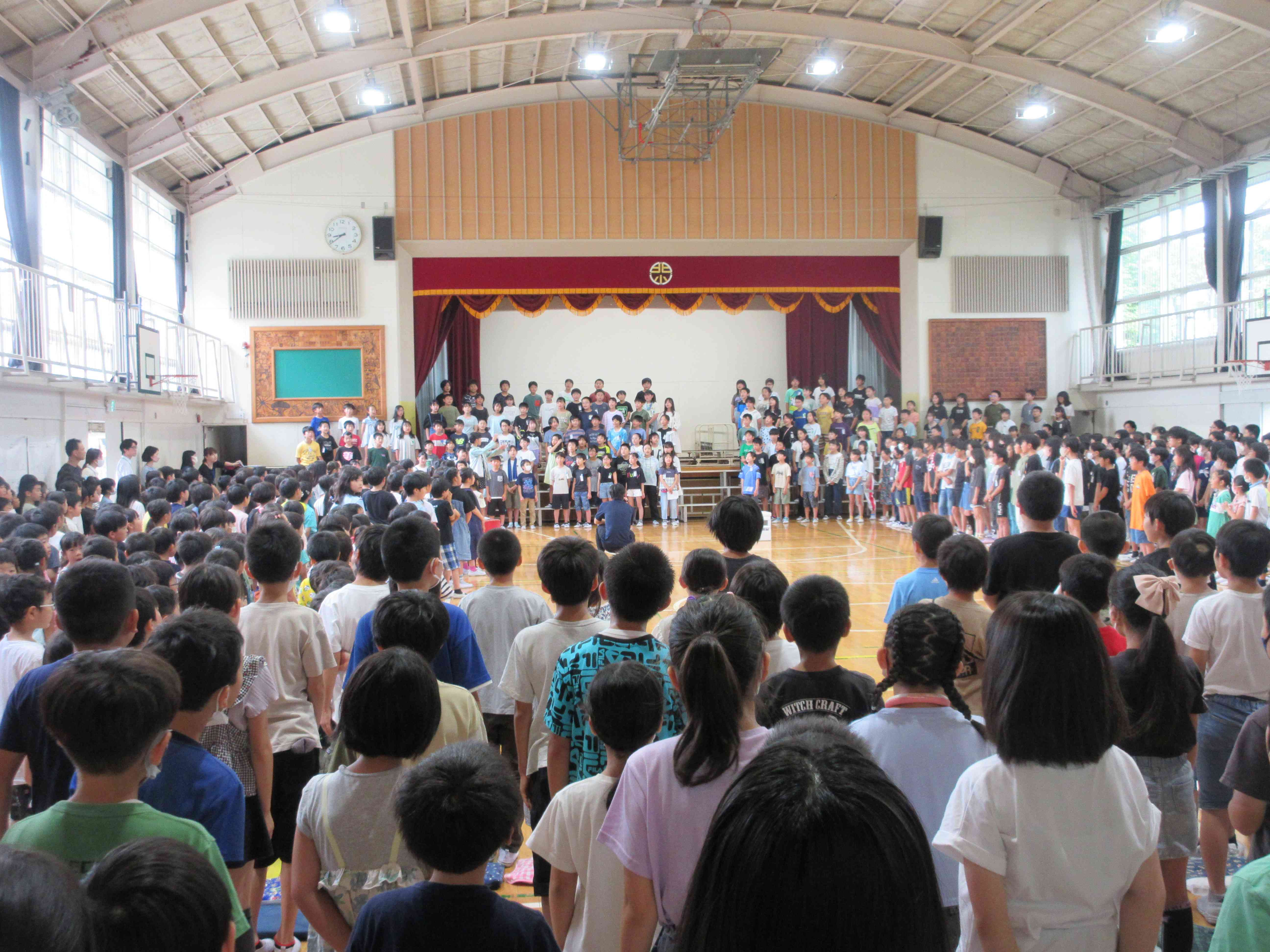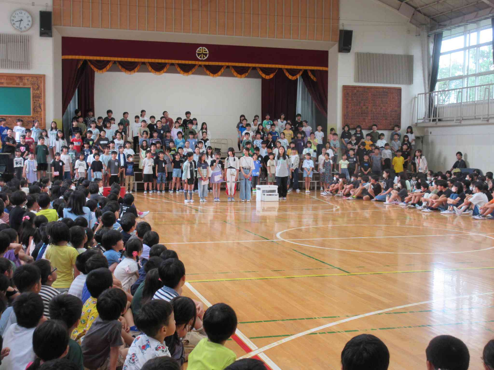 6月の音楽集会は5年生の発表でした。 5年生の歌声が響き渡ると、 どこからかツバメが飛んできて、 体育館の上の方で舞っているようでした。 そのあと、全員で「ビリーブ」を歌いました。