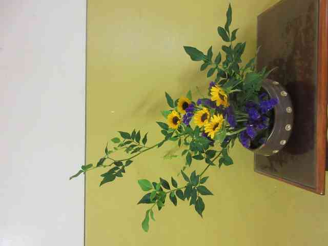 7月5日のお花は、 そけい、ひまわり、サターチスです。 5本のひまわりがお話をしているようです。 個人面談等でのご来校の際に、 中央玄関金魚の横にお花を生けてくださっていますので、 どうぞご覧ください。
