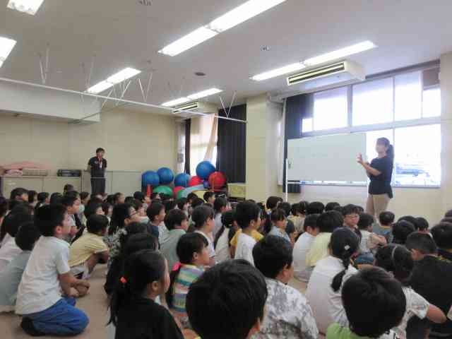 朝の活動時間に、1年生の学年集会がありました。 2学期の行事や50周年式典での1年生の発表についての話を聞きました。 2学期から実行委員を作るといったとき、 もう立候補の意思を示している子がいました。 3年生は1時間目に学年集会をしました。 2学期の行事の話の後、転入してきたお友達の紹介もしました。 質問タイムもありました。 最後は、◯✕クイズをしました。 どちらの学年も、子どもたちが話を聞くときには真剣に、 楽しいときには笑顔で、集会に参加していました。【添付ファイル】