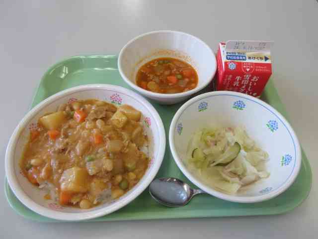 今日の献立は、ビーンズカレーライス、フレンチサラダ、牛乳です。豚肉は神奈川県内産です。 フレンチサラダには、キャベツ、きゅうり、玉ねぎ、ハムが入っています。今が旬のきゅうりは、水分が多くて、体を冷やす働きがあるので、暑い季節にはぴったりの食べ物です。野菜をもりもり食べてください。 きゅうりは、体の調子を整えるみどりのなかまの食べ物です。